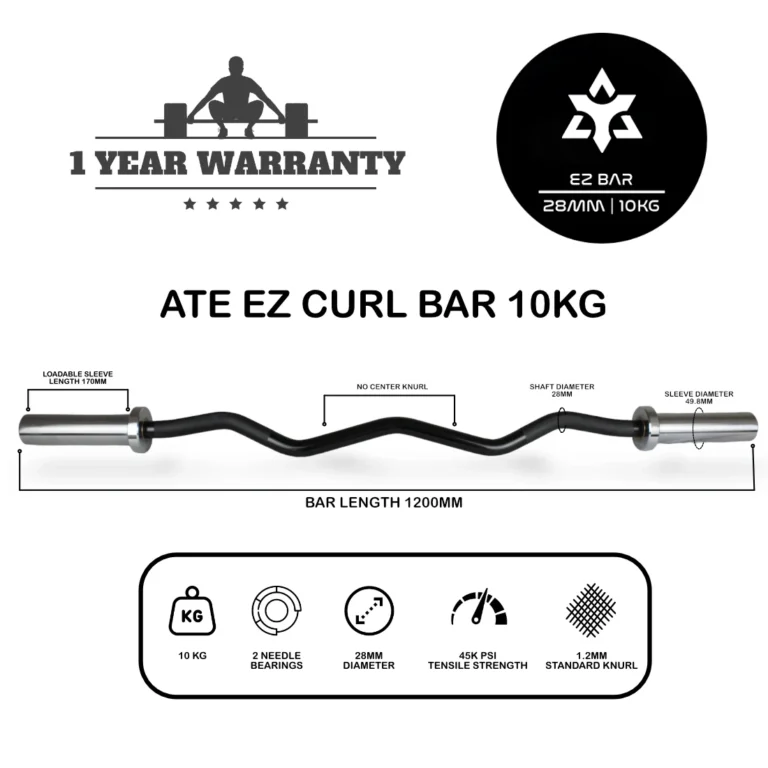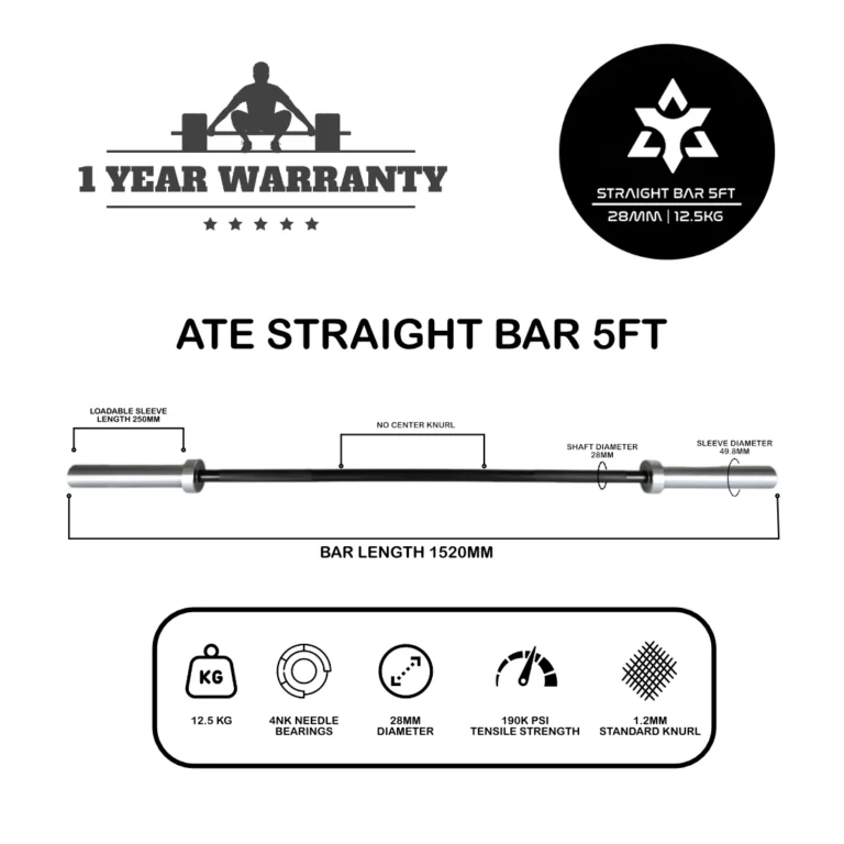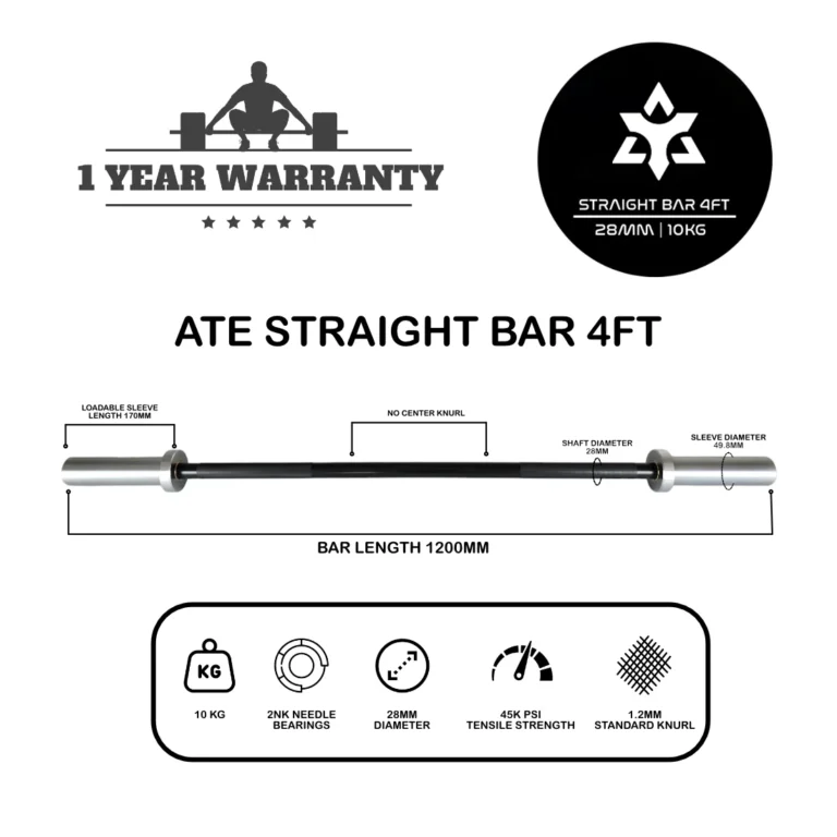 Are you passionate about sculpting your arms with the classic straight curl bar? Then ATE Straight Bar 4ft is tailor-made for you. This specialised bar is meticulously crafted to target and isolate the biceps, triceps, and forearm muscles, helping you achieve your desired arm strength and definition. Whether you're aiming to build mass or tone your muscles, this bar provides the ideal tool to enhance your arm training regimen.