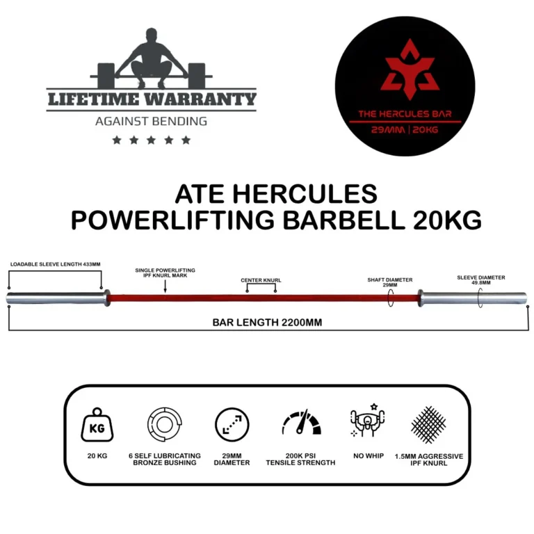 The shaft is Red Cerakote finish with aggressive 1.5MM Volcano Knurl which feels great in the hand even with the Cerakote finish. The sleeves are Hard Chrome to protect from oxidation and wear due to loading/unloading of the plates. The TESIRO Hercules Barbell is made from special steel alloy.
