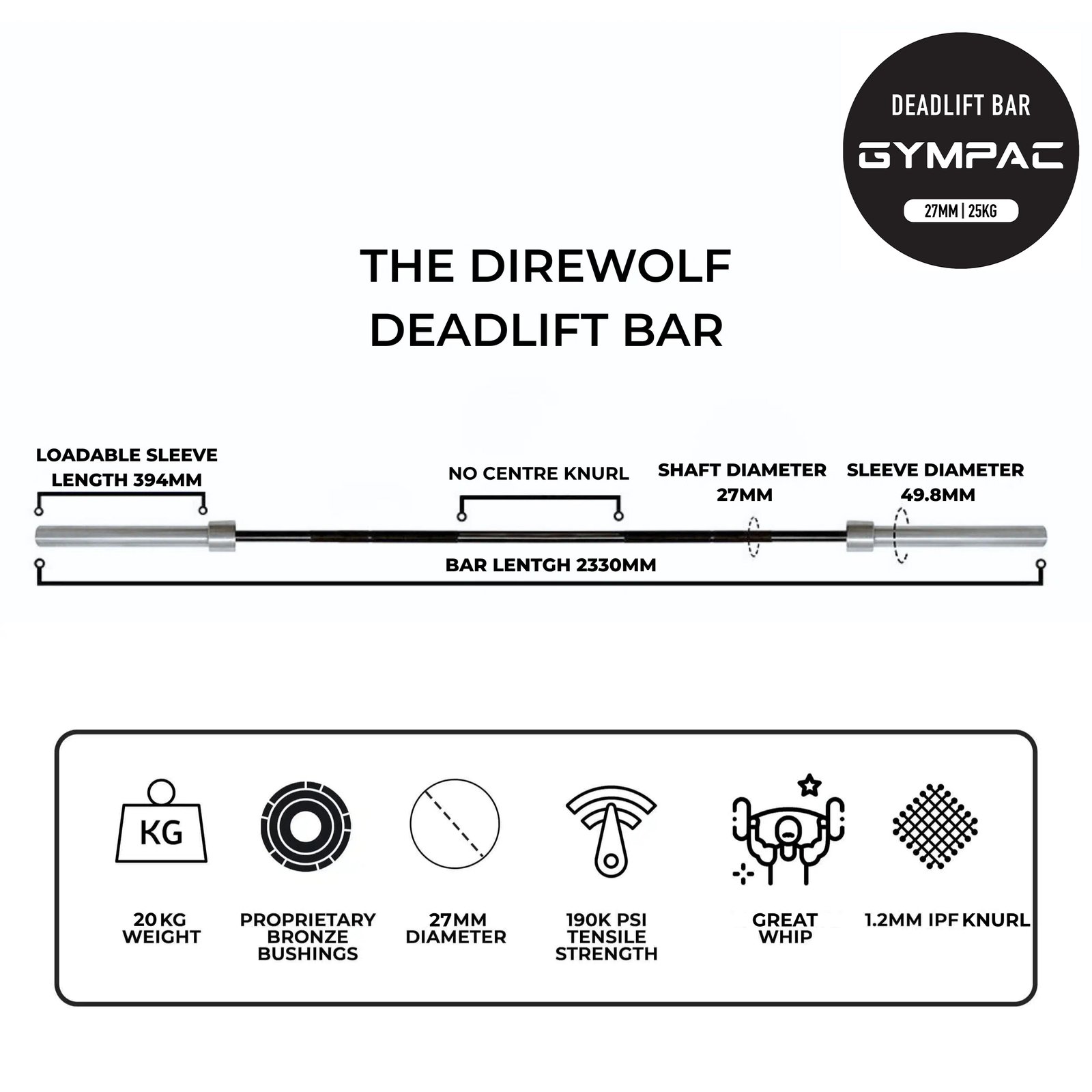 Unlike standard Olympic bars, the slightly wider sleeve spacing is strategically designed to support better whip action during heavy deadlifts. Built for competitive athletes and elite training center’s, this specialised deadlift bar is the ultimate choice for those who are serious about maximising their deadlift potential.