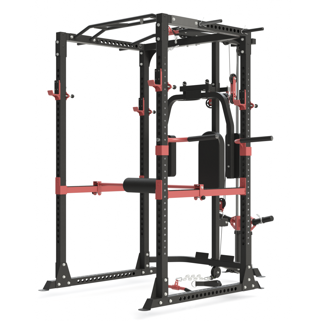 With the large amount of safety points as well as band pegs for positive and negative functional strength training, it offer large variety of the most effective free-weight exercises. Combine this with the optional Lat Pull Down/Low Row and Cable Crossover options for the ultimate workout in the comfort of your own home. Although it can be used by three people at the same at is still very compact.
