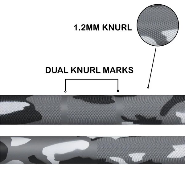 Presenting the TESIRO Arctic Camo Bar 20kg with a beautiful Cerakote Camo Shaft finish which is unique and an attention grabber in any fitness box, personal studio, gym, or even a professional weightlifting training center! The 1.2MM diamond knurl never disappoints and the high weight capacity of 1700lbs/770kgs lets you train and lift till you break your PR’s without ever stressing out about breaking our bar!