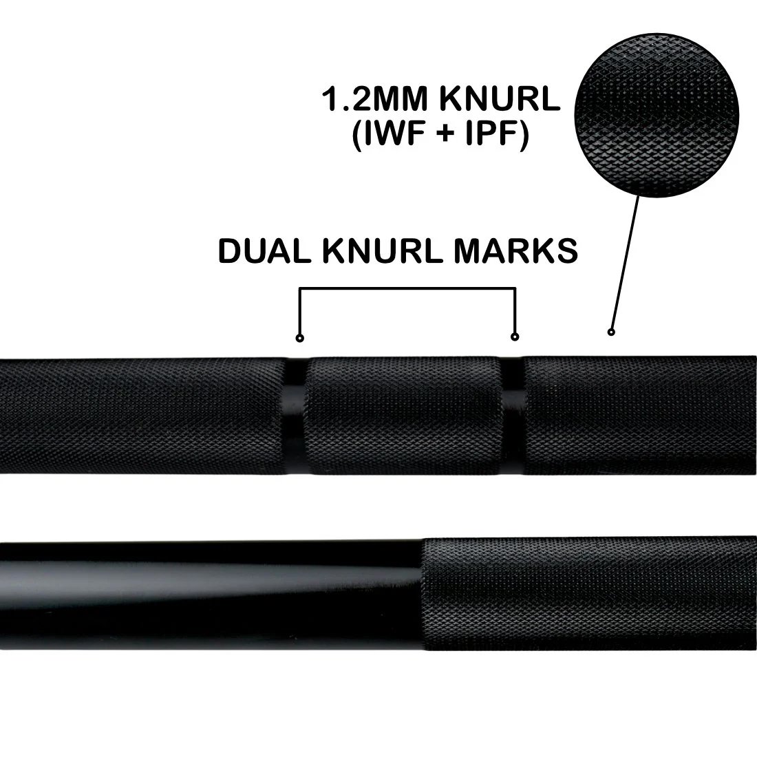 - Dual International Weightlifting + Powerlifting Knurl Marks