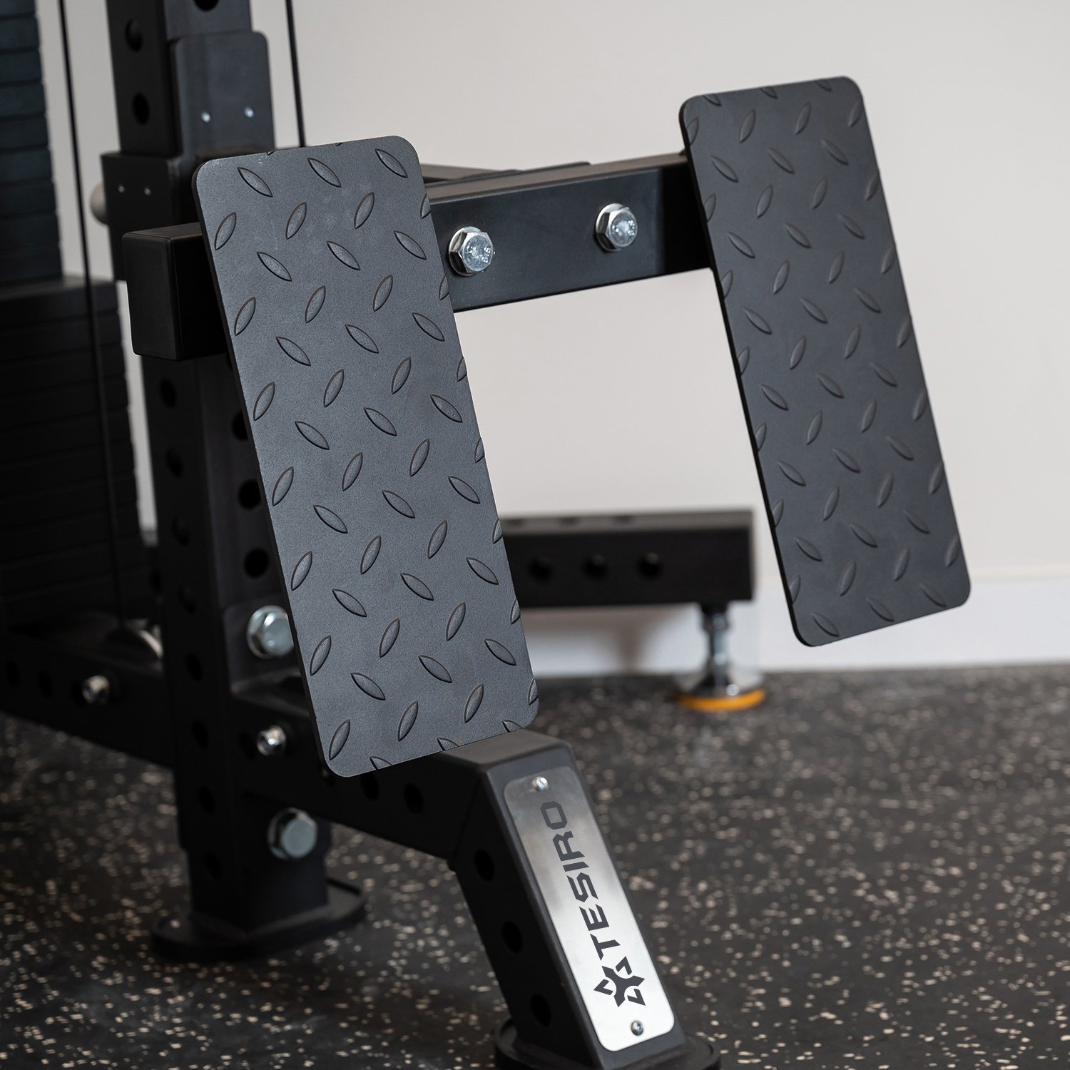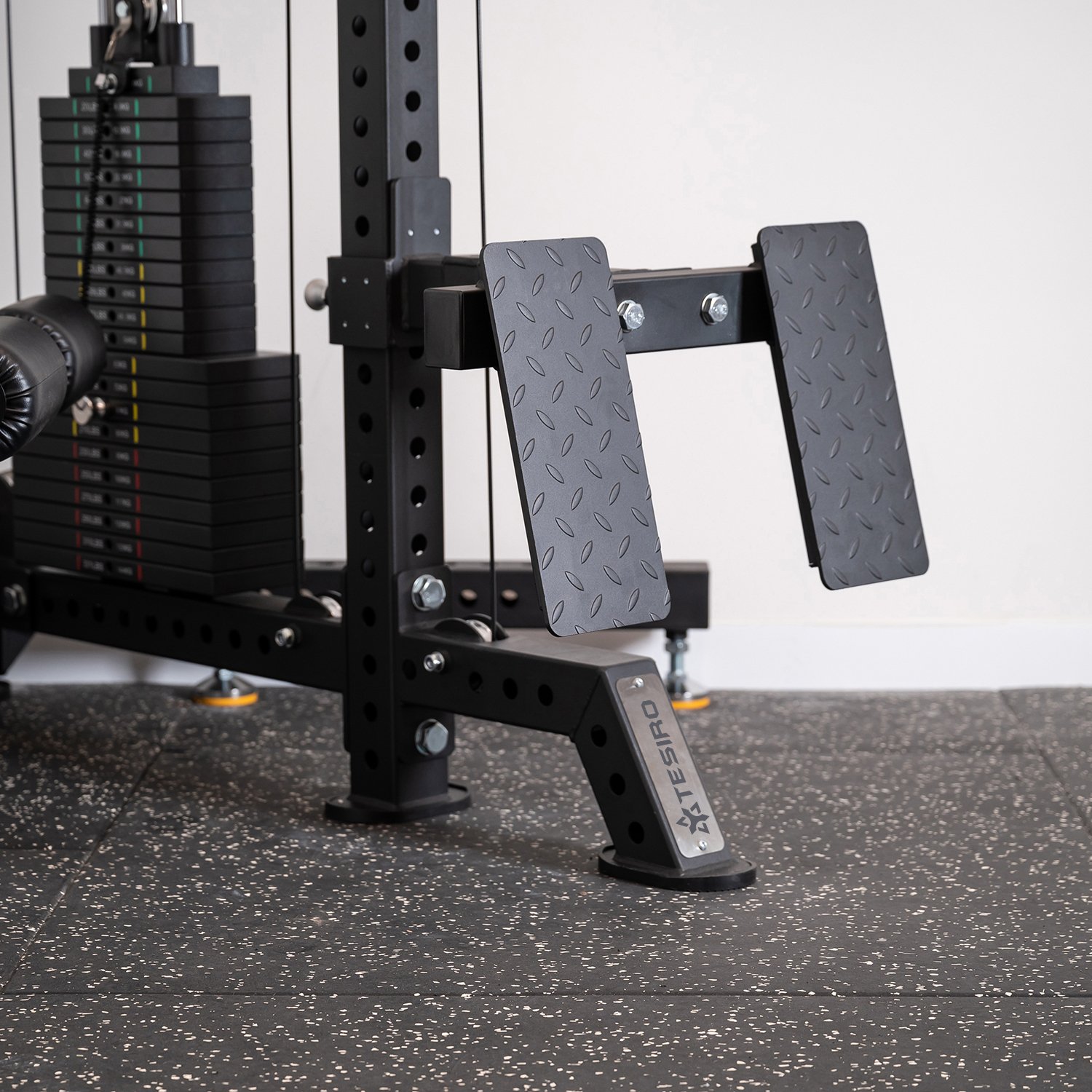 GS03 Tesiro Sports Deluxe Smith Machine is an ideal blend of a Smith Machine and a Squat/Half Rack, allowing for training with both loose weights and the stability of fixed weights within the Smith Machine. Its heavy steel construction and smooth guide rods ensure optimal training performance and safety.